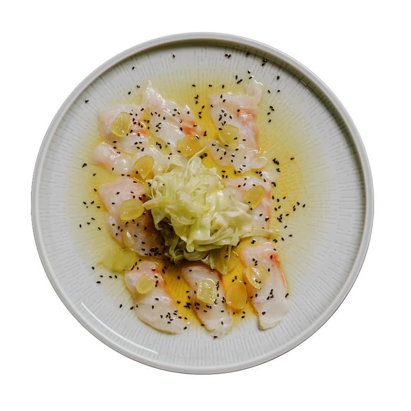 Served with citrus infusion, white grapes, black sesame seeds, fresh coriander and fennel