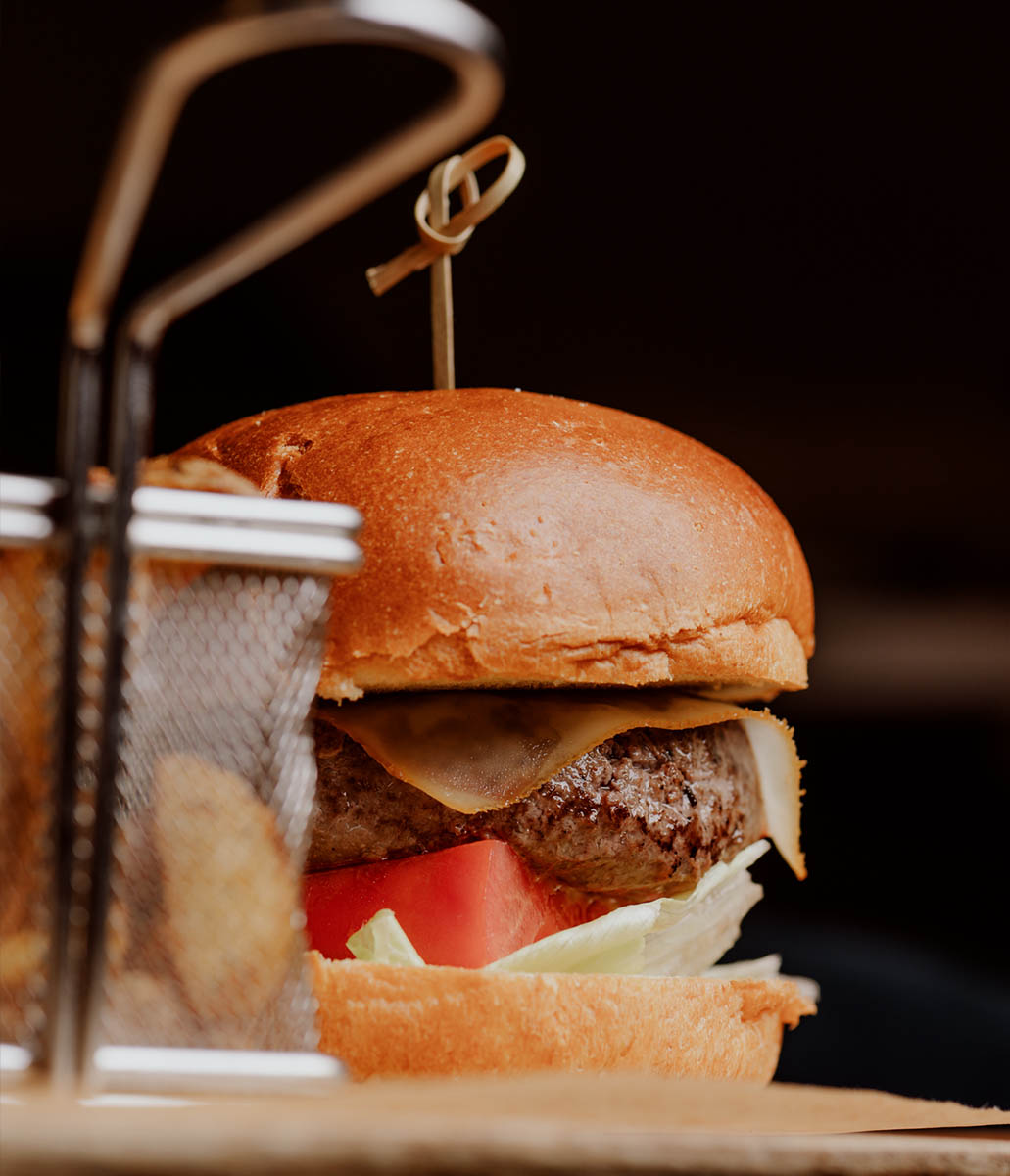 Κιμάς από black angus, μετσοβόνε, τραγανό μπέїκον, ντομάτα, καραμελωμένα κρεμμύδια, μαγιονέζα τρούφας. Σερβίρετε με τηγανητές πατάτες* country